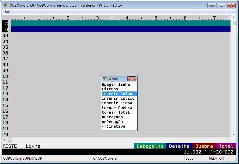 Enter ou clicando com o botão esquerdo do mouse, surgirá o menu Ação que tem apresentação variável de acordo com o que é permitido no contexto e define propriedades para a posição em foco.
