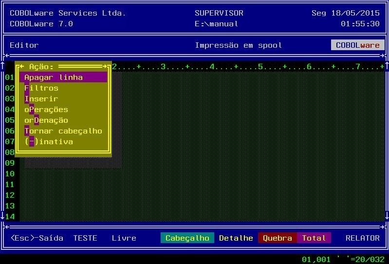 A tela de edição permite a livre alteração de uma matriz de 99 linhas por 220 colunas. Podem ser usadas as teclas de movimentação do cursor ou o mouse para posicionar o cursor na matriz.